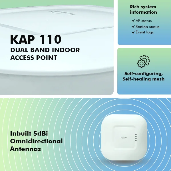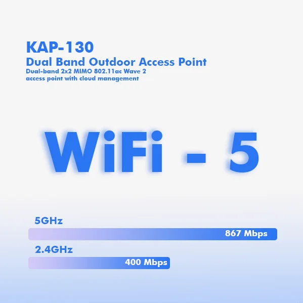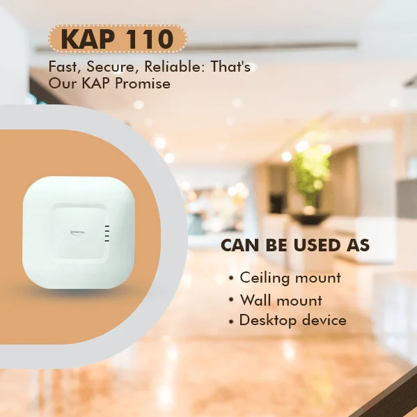 KAP-110 is a two-radio, cloudmanaged 2x2 MIMO 802.11ac Wave 2 access point. Designed for general purpose, next-generation deployments in indoor locations , the KAP110 offers performance, enterprise-grade security, and intuitive management. The KAP-110 delivers a maximum 1.3 Gbps* aggregate frame rate with concurrent 2.4 GHz and 5 GHz radios. KAP110 delivers the high throughput, reliability, and flexibility required by the most demanding business applications like voice and high-definition streaming video, even in the harshest outdoor environments .