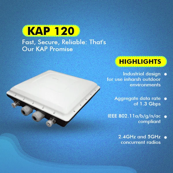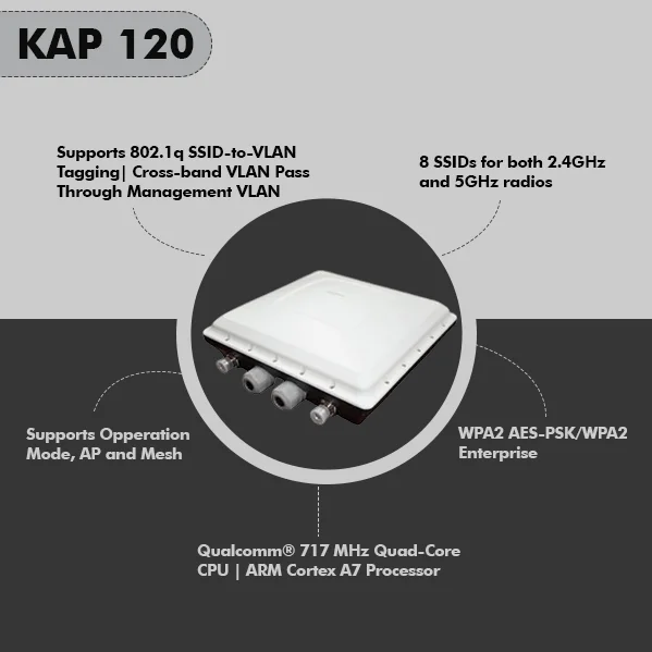Kenstel KAP-120 is a two-radio, cloud-managed 2x2 MIMO 802.11ac Wave 2 access point. Designed for general purpose, next-generation deployments in harsh outdoor locations and industrial indoor conditions, the KAP120 offers performance, enterprise-grade security, and intuitive management. The KAP-120 delivers a maximum 1.3 Gbps* aggregate frame rate with concurrent 2.4 GHz and 5 GHz radios. KAP120 delivers the high throughput, reliability, and flexibility required by the most demanding business applications like voice and high-definition streaming video, even in the harshest outdoor environments