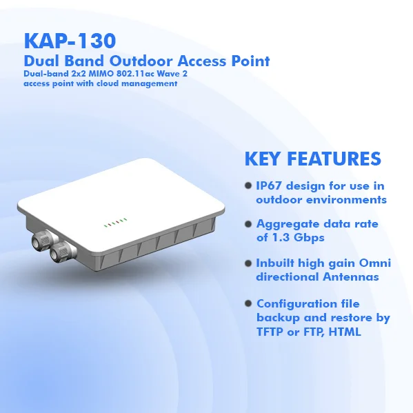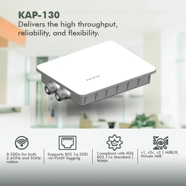 Kenstel KAP-130 is a two-radio, cloud-managed 2x2 MIMO 802.11ac Wave 2 access point. Designed for general purpose, next-generation deployments in outdoor locations and industrial indoor conditions, the KAP130 offers performance, enterprise-grade security, and intuitive management. The KAP-130 delivers a maximum 1.3 Gbps aggregate frame rate with concurrent 2.4 GHz and 5 GHz radios. KAP130 delivers the high throughput, reliability, and flexibility required by the most demanding business applications like voice and high-definition streaming video, even in the harshest outdoor environments.