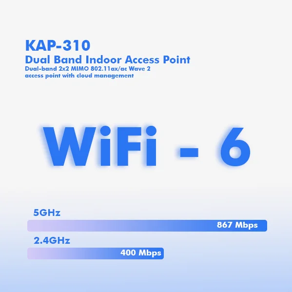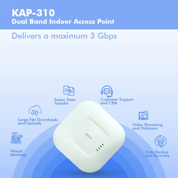KAP-310 is a two-radio, cloudmanaged 2x2 MIMO 802.11ax/ac Wave 2 access point. Designed for general purpose, nextgeneration deployments in indoor locations , the KAP310 offers performance, enterprise-grade security, and intuitive management. The KAP-310 delivers a maximum 3 Gbps* aggregate frame rate with concurrent 2.4 GHz and 5 GHz radios. KAP310 delivers the high throughput, reliability, and flexibility required by the most demanding business applications like voice and high-definition streaming video, even in the harshest outdoor environments.