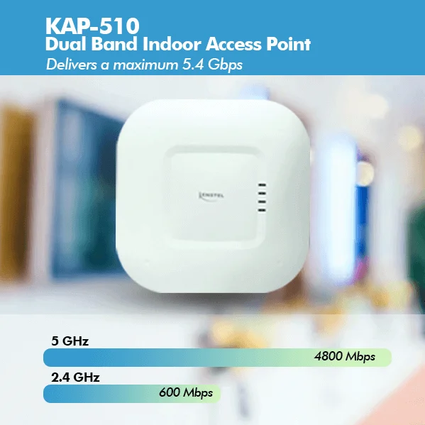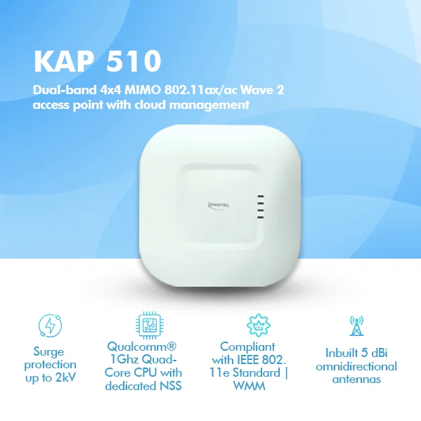 KAP-510 is a two-radio, cloud- managed 4x4 MIMO 802.11ax/ac Wave 2 access point. Designed for general purpose, next- generation deployments in indoor locations , the KAP510 offers performance, enterprise-grade security, and intuitive management. The KAP-510 delivers a maximum 5.4 Gbps* aggregate frame rate with concurrent 2.4 GHz and 5 GHz radios. KAP510 delivers the high throughput, reliability, and flexibility required by the most demanding business applications like voice and high-definition streaming video.