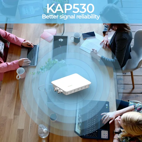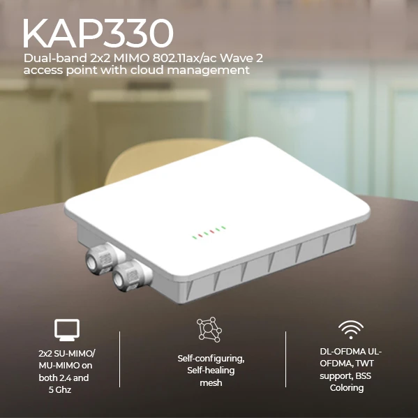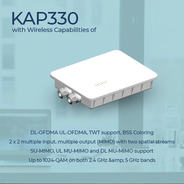 KAP-310 is a two-radio, cloudmanaged 2x2 MIMO 802.11ax/ac Wave 2 access point. Designed for general purpose, nextgeneration deployments in indoor locations , the KAP310 offers performance, enterprise-grade security, and intuitive management. The KAP-310 delivers a maximum 3 Gbps* aggregate frame rate with concurrent 2.4 GHz and 5 GHz radios. KAP310 delivers the high throughput, reliability, and flexibility required by the most demanding business applications like voice and high-definition streaming video, even in the harshest outdoor environments.